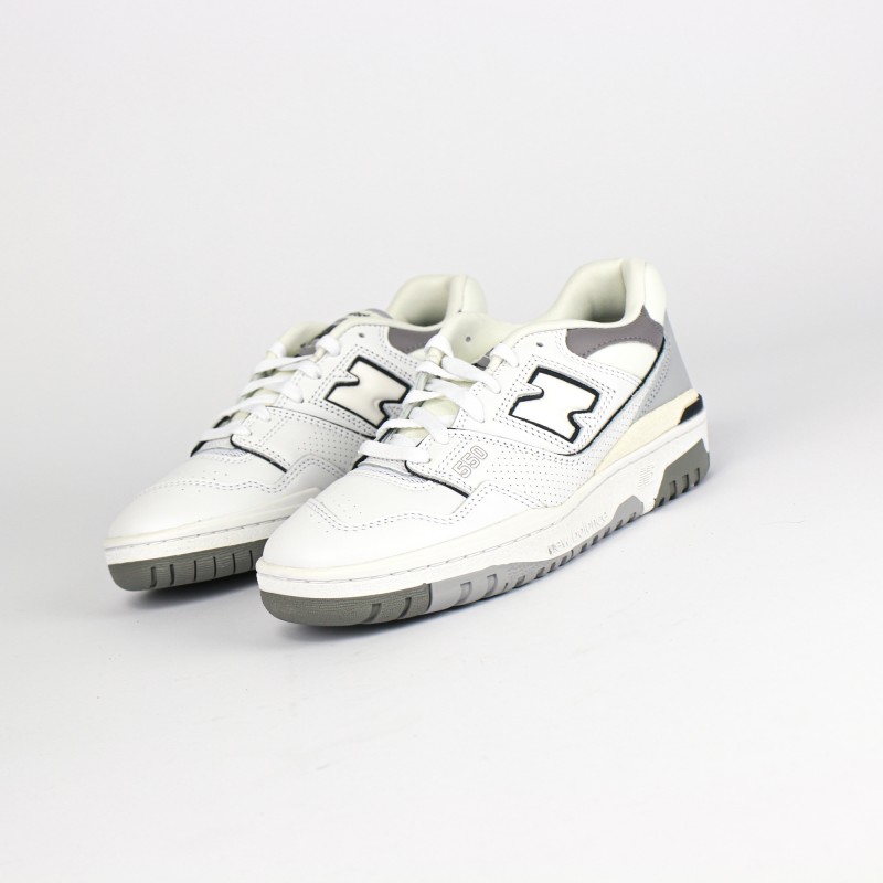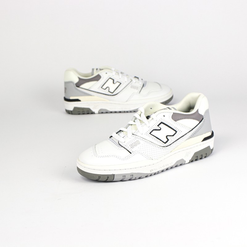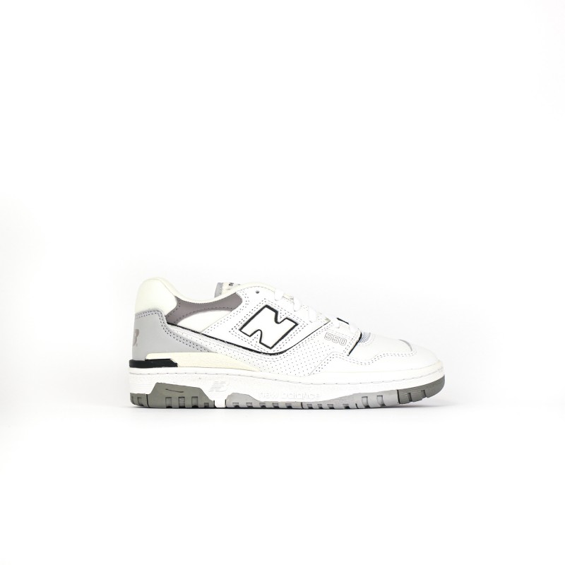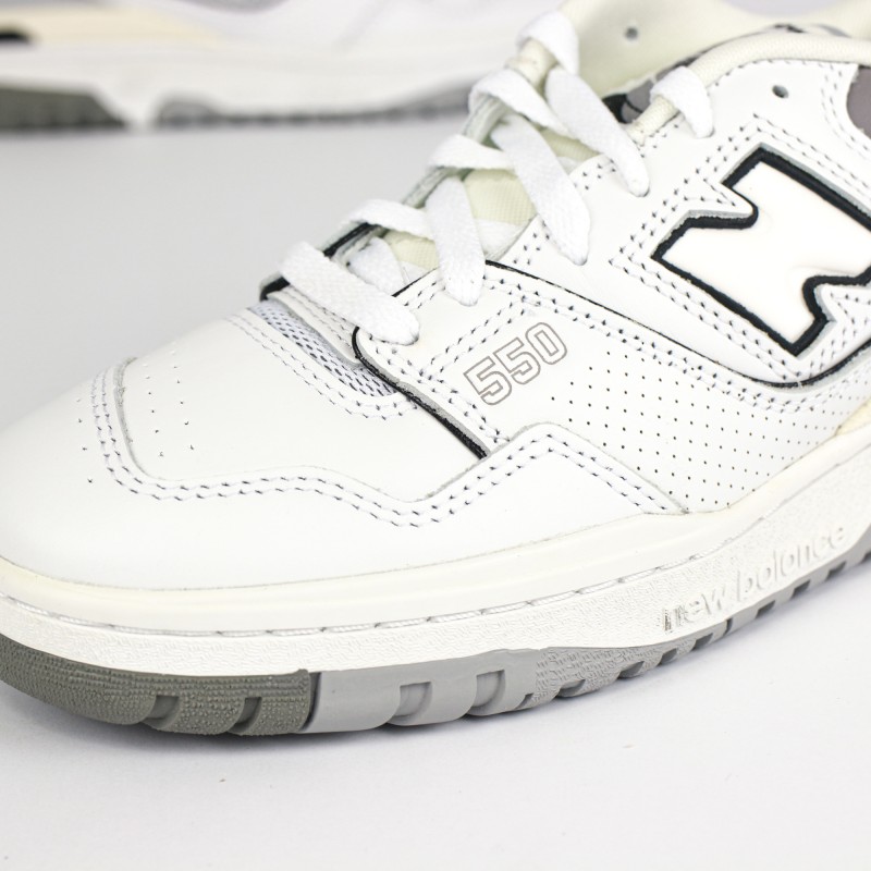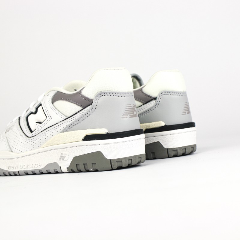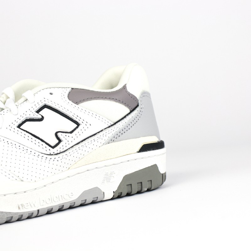 On retrouve une empeigne en cuir blanc premium en partie perforées ainsi que des nuances de cuir gris,  donnant du contraste à la sneaker.
