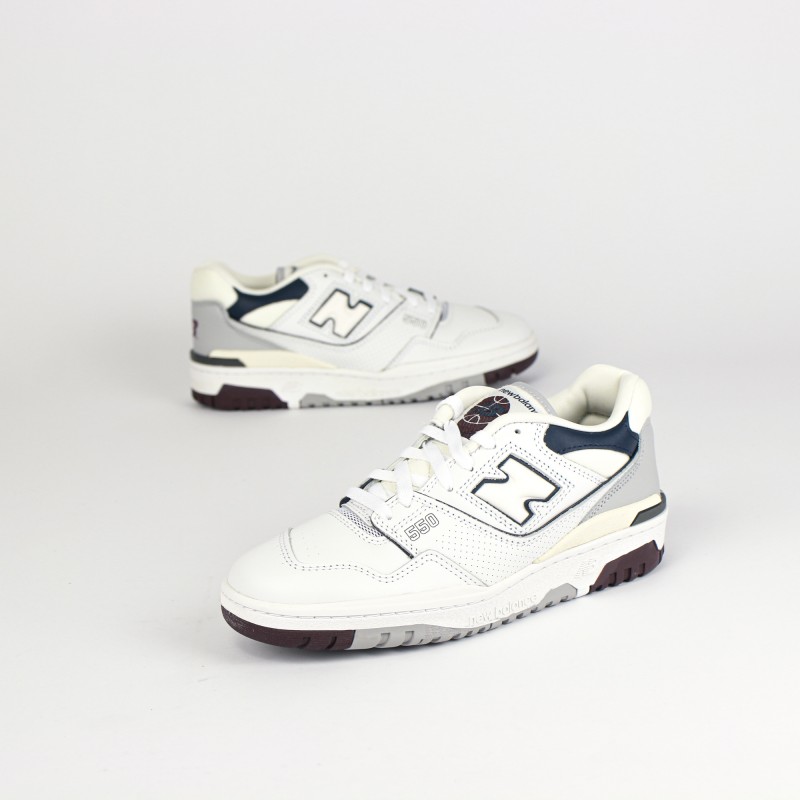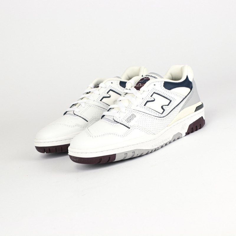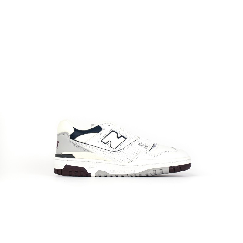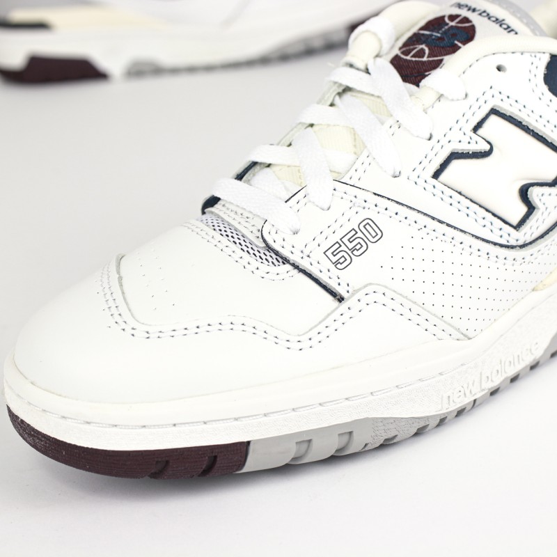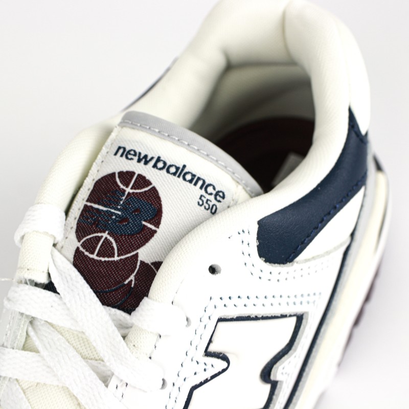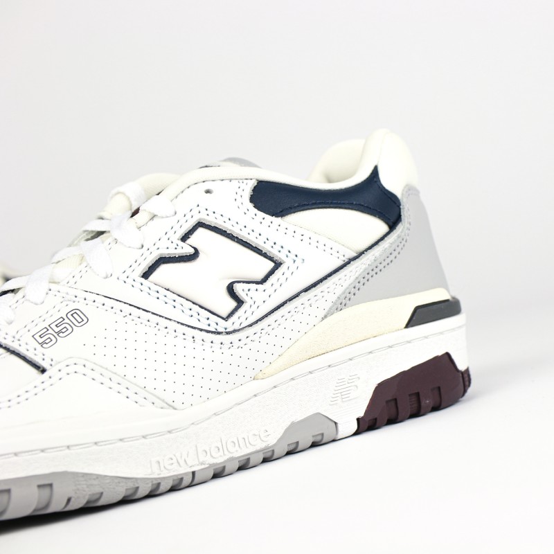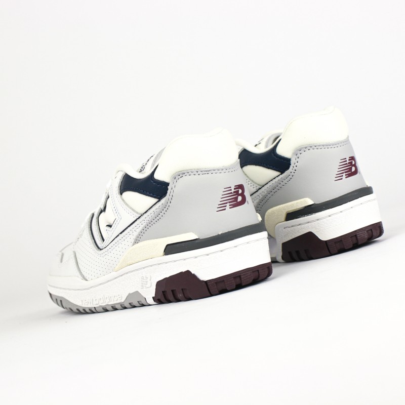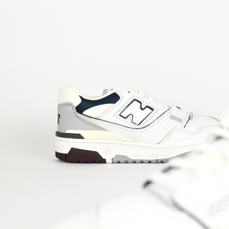 On retrouve une empeigne en cuir blanc premium en partie perforées ainsi que des nuances de cuir gris, bleu marine et bordeaux donnant du contraste à la sneaker.